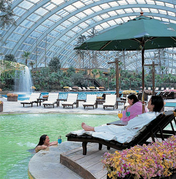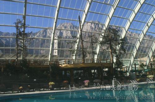 一年后,再次住進九寨天堂,當別人涌向那114個海子的時候,我一個人泡在可供2000人沐浴的溫泉里。上午陽光燦爛,連蒸騰中的水汽都仿佛染上了一層金色,仙境一般,遠處雪山在望,被鋼筋分割成塊的湛藍天空上,淡如柳絮的白云,從一塊玻璃慢慢地飄進另一塊玻璃,不見一百一十四塊海子,卻在這里悠然重溫了九寨之夢。