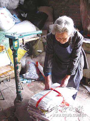 昨日,九龍坡區(qū)黃桷坪街道高家坪電力4村一平房。白發(fā)蒼蒼的夏淑清用了一上午時間,將屋內(nèi)堆得高高的廢報紙一張張理平,碼放整齊后,用紅繩仔細捆了起來。“這些報紙,夠我和媽一周的米錢了。”看著整理好的報紙,夏淑清捶了捶酸痛的腰,露出滿足的笑。